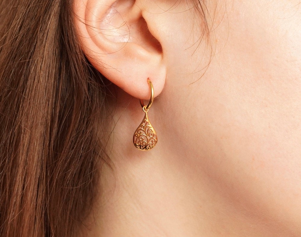 Gold Filigree Drop Hoop Earrings * Boho earrings * Hoop * Feminine jewellery