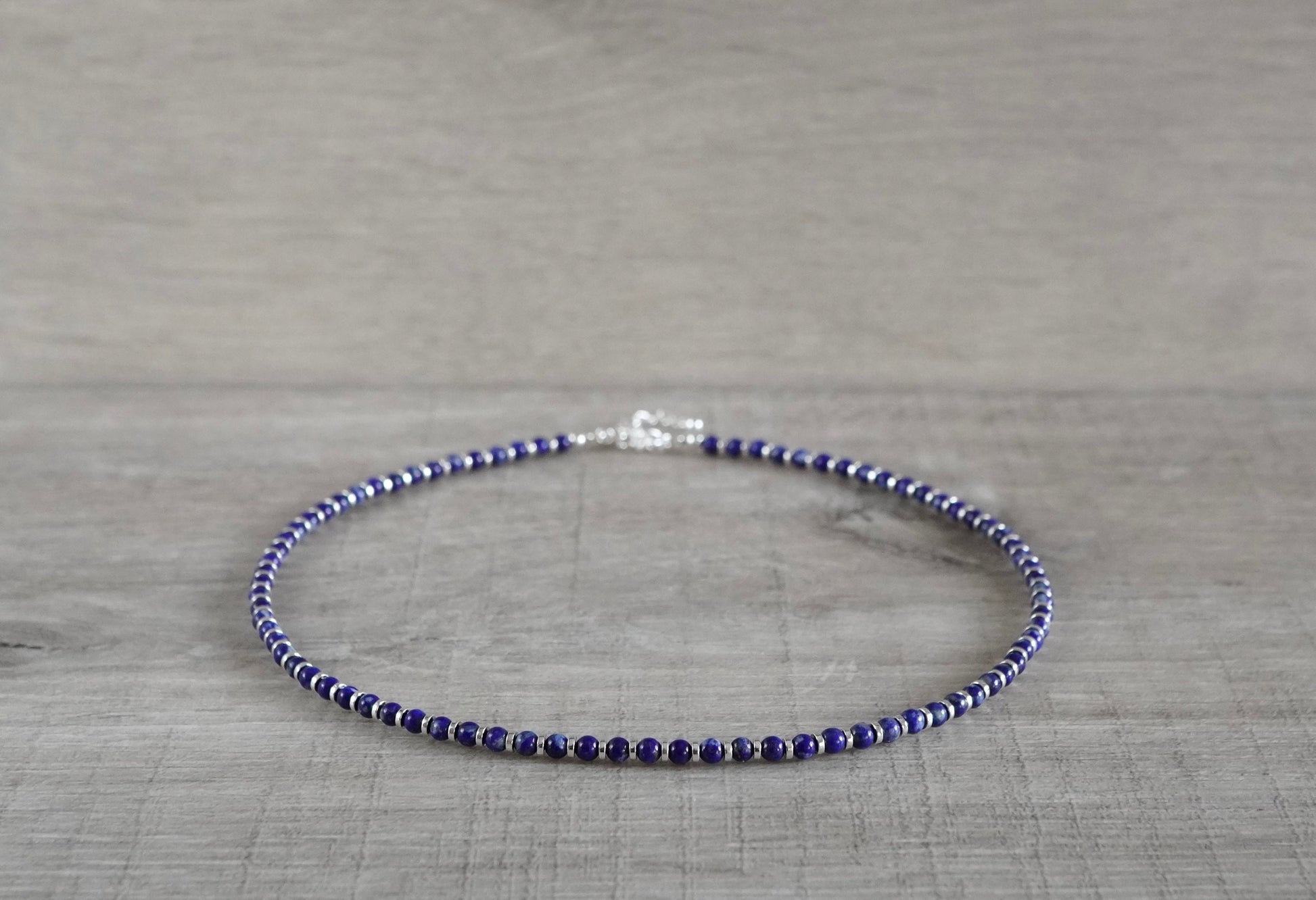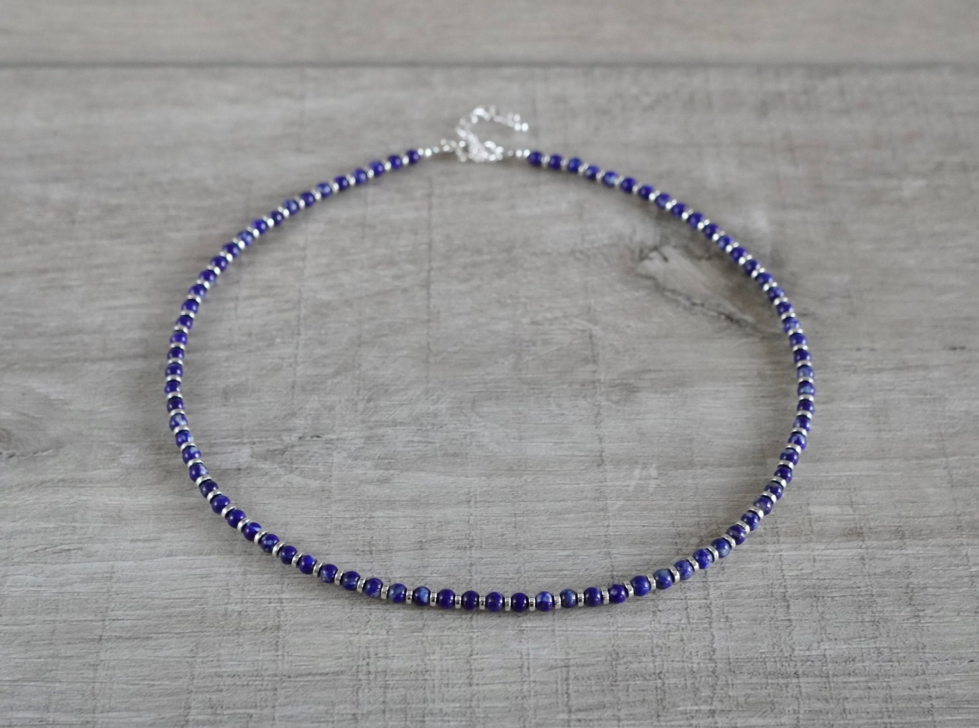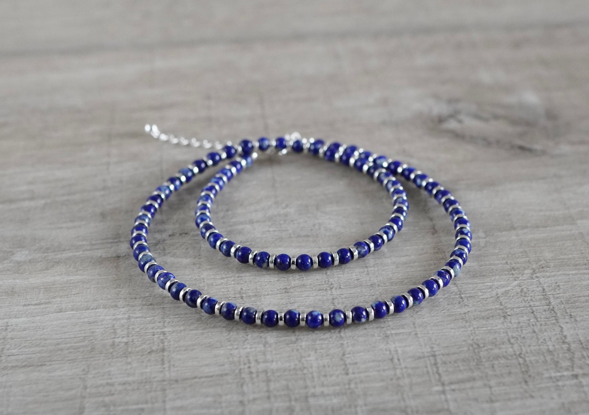 Material: 3mm lapis bead, hematite rondelle, sterling silver clasp and 2"extension chain