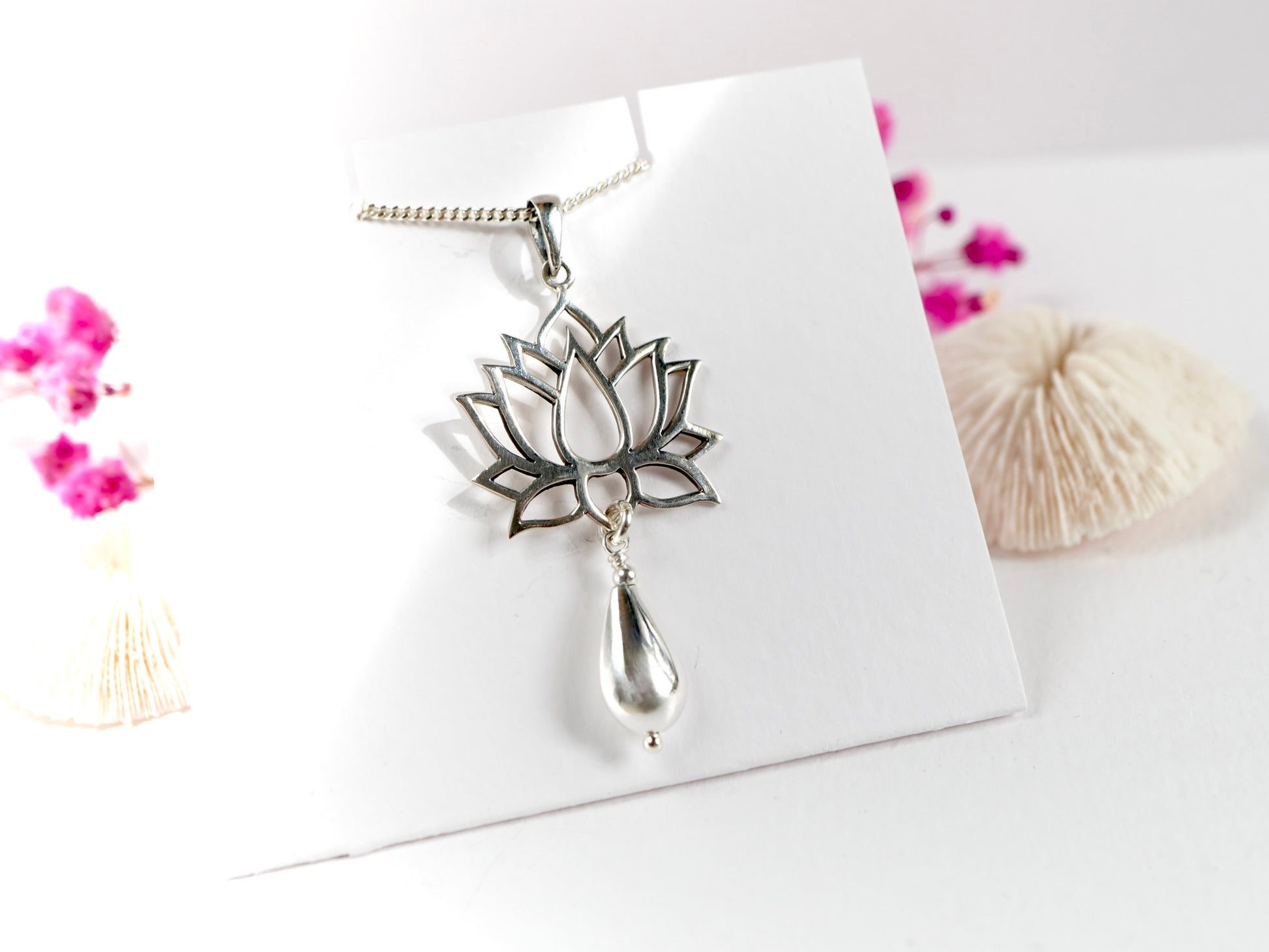 Lotus Flower Serling Silver Pendant Necklace with Teardrop Charm * Gift for nature lovers * Minimalist Yoga Jewellery