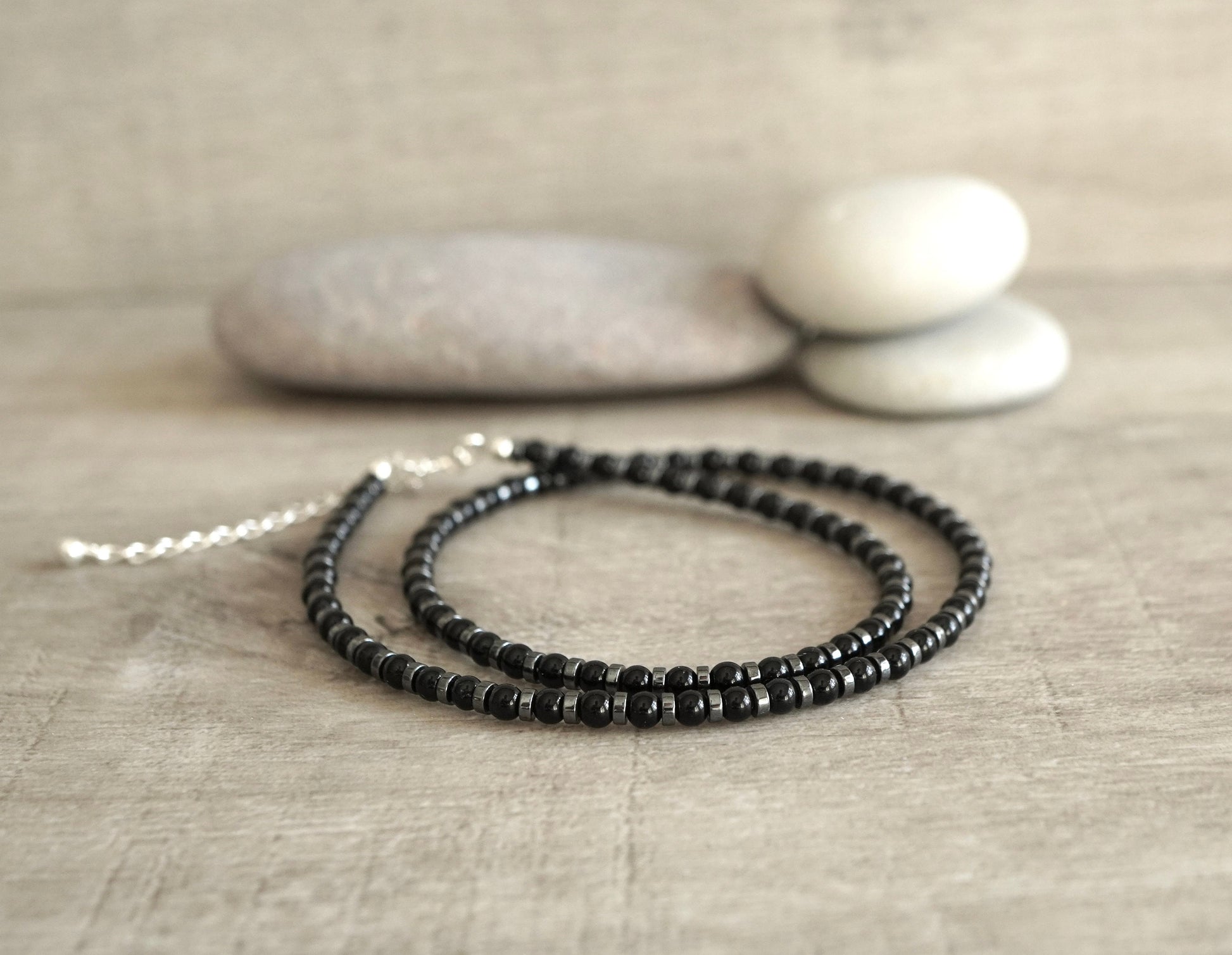 Material: 3-4mm onyx bead, hematite heishi bead, sterling silver clasp and 2"extension chain